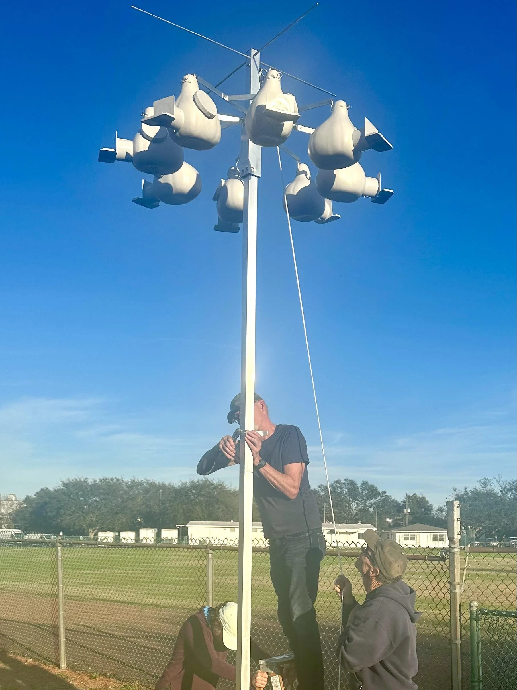 So why did St. Pete Audubon put up this array? On the East Coast of the U.S., Purple Martins are essentially reliant on humans to find suitable housing. For hundreds of years, these birds have lived in some sort of artificial nest. Nowadays, the species is in decline. Birders and organizations like SPAS put up plastic “gourds” to give these tired migratory birds a place to nest.