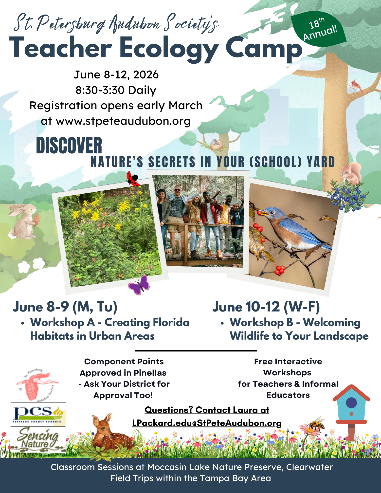 In the past, St. Petersburg Audubon Society awarded yearly scholarships to two teachers to attend the National Audubon Teachers Camp at Hog Island, Maine. Due to economic and restructuring issues, the Audubon camps at Hog Island were cancelled. Dr. Harold Albers turned those unfortunate events into one spectacular achievement for our chapter - our first teachers’ ecology camps. Our goal is to train and to inspire teachers who would then instill an understanding and awareness of wildlife and habitat conservation in their students. The purpose of the environmental education camps is to increase the environmental knowledge of the participants and to provide environmental curriculum and activities that the teachers could take back into their classrooms.